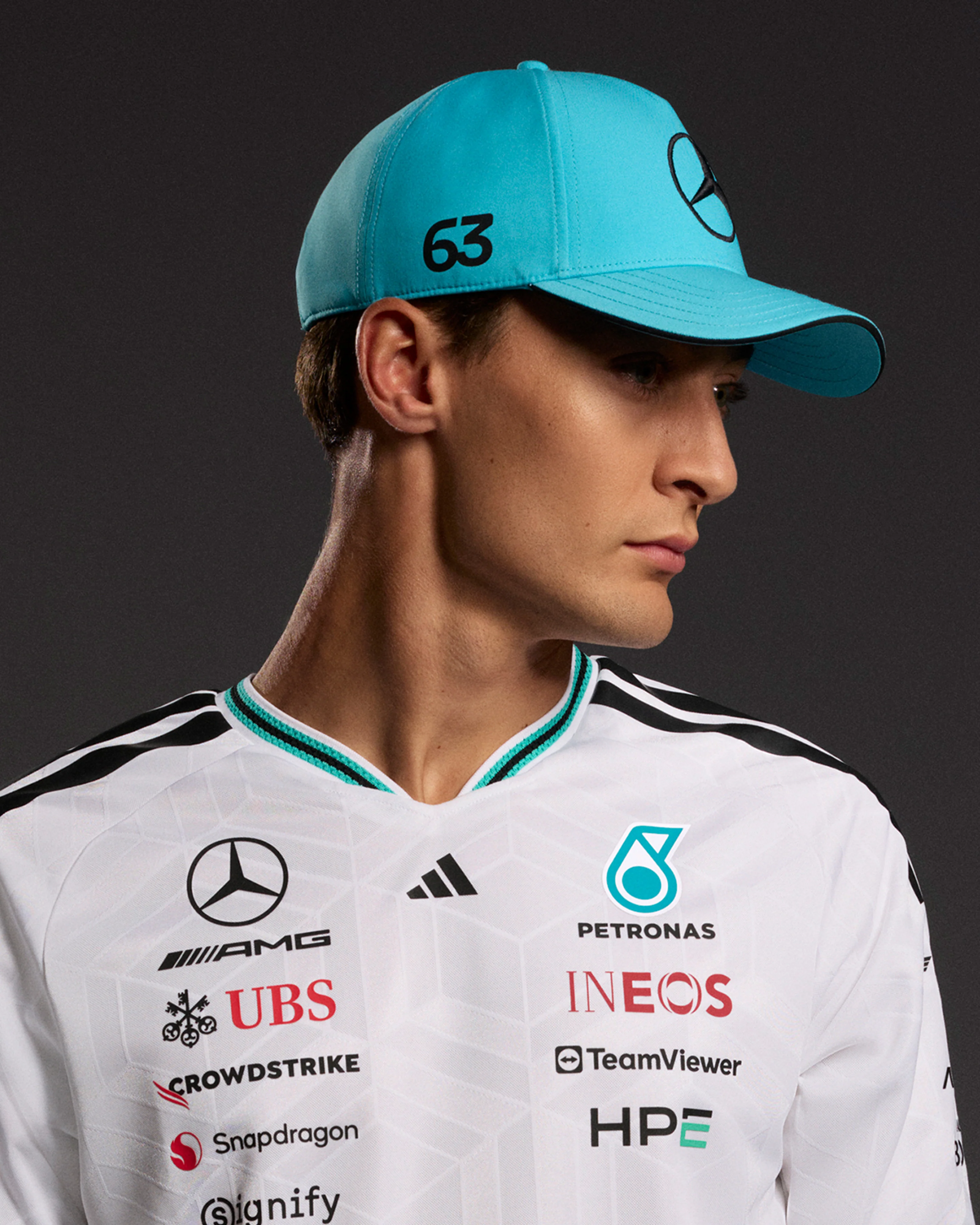 The Mercedes - AMG Petronas Formula 1 Team George Russell Cap is your ticket to showcasing your passion for motorsport. With the iconic Mercedes star on the front and George Russell's signature and number on the side, this cap is a must-have for fans.