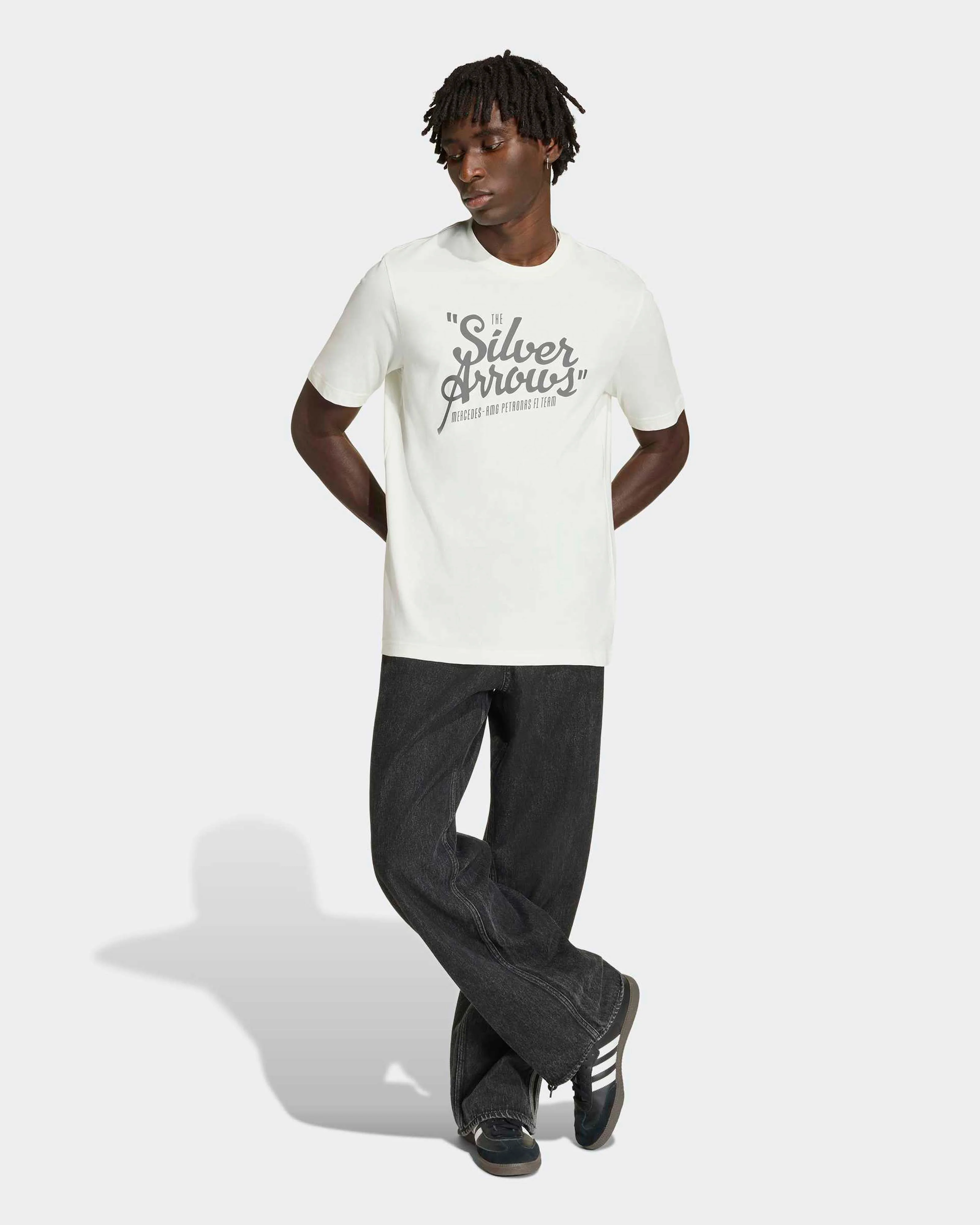 The Mercedes - AMG Petronas Formula 1 Team Silver Arrows Tee Men is designed for fans who appreciate both style and comfort. With a regular fit and crew neck, this t-shirt offers a modern silhouette, complete with updated fits, fabrics, and branding. The embroidered 56mm three-bar logo adds a touch of elegance, making it an ideal choice for showcasing your support for the team. Embrace the spirit of motorsport with this essential fan item.