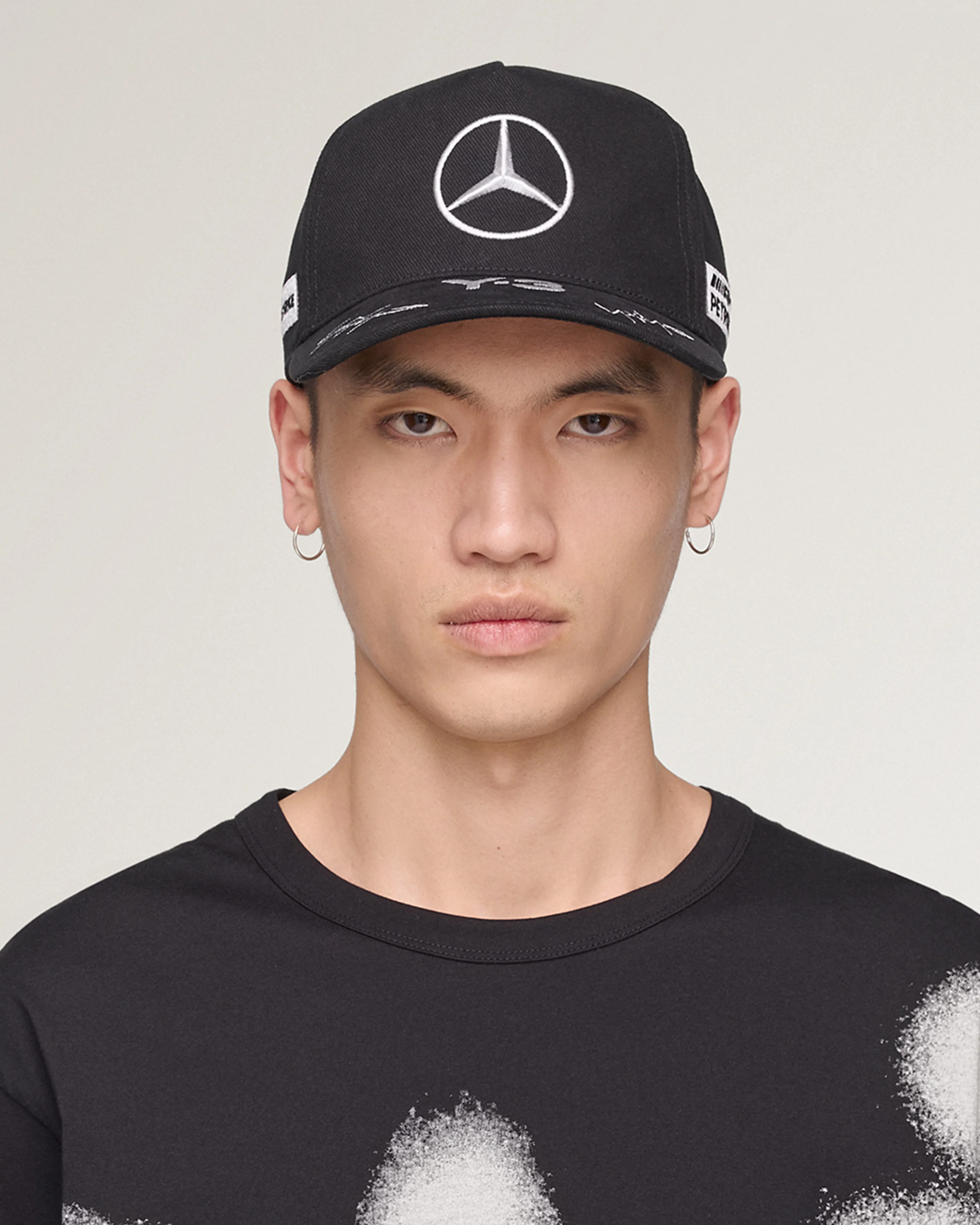 The centre front is adorned with an embroidered Mercedes-Benz Star, while the brim showcases the Y-3 logo, framed by Yohji Yamamoto’s signature. Motorsport enthusiasts will appreciate the CrowdStrike logo on the left panel and AMG Petronas embroidery on the right.